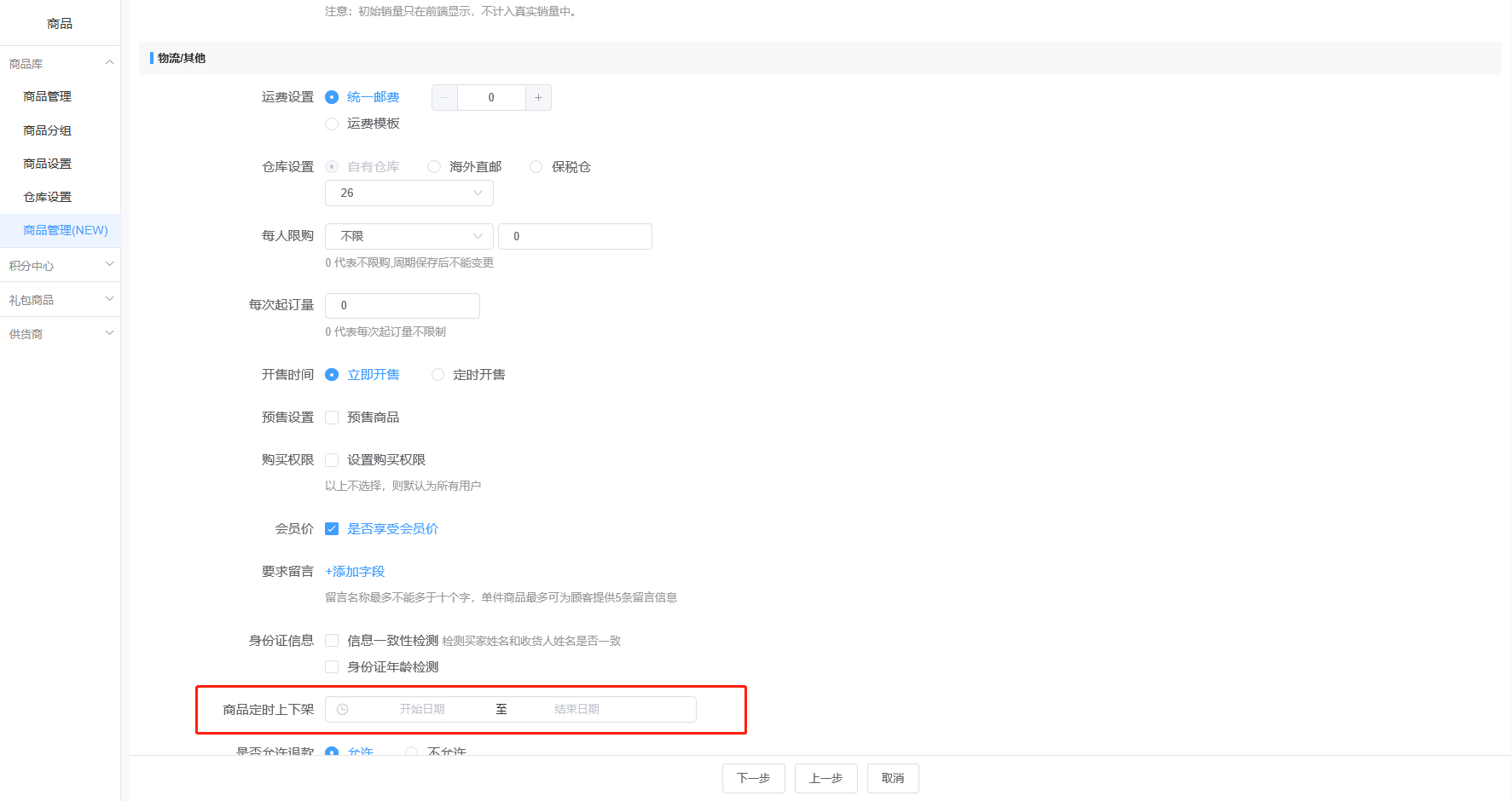 注意:若在配置了自动上下架后,商家手动对商品上架/下架,则会清空掉自动设置的时间。