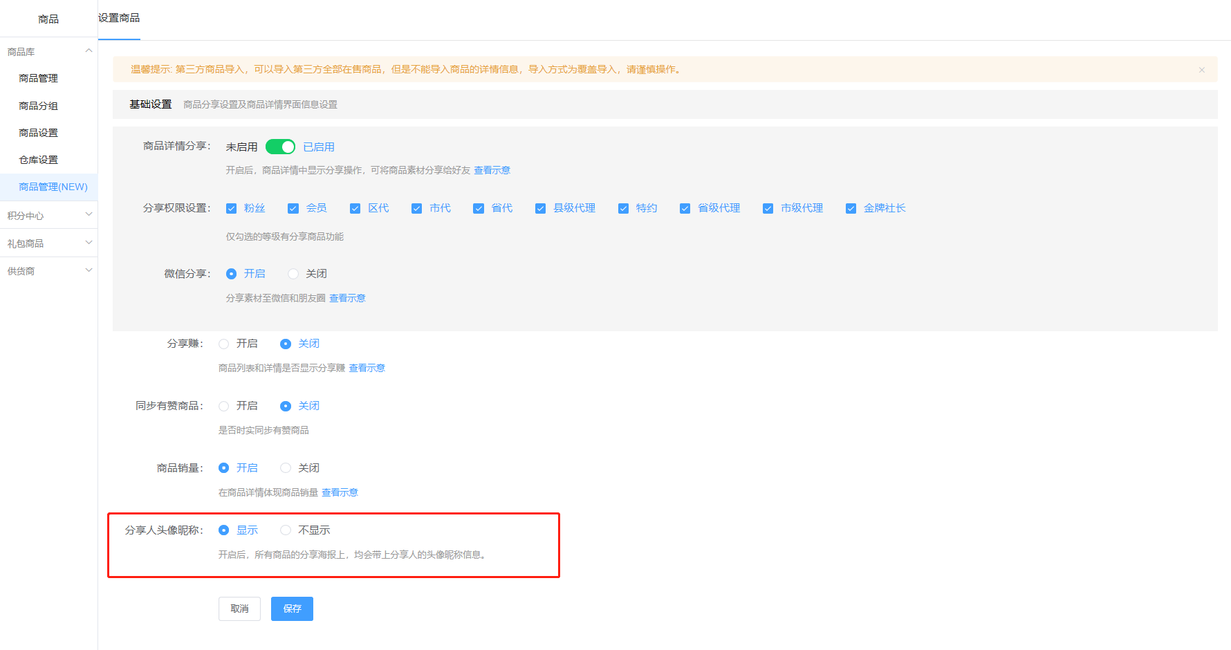 操作路径:商品-商品库-商品管理(New)-设置商品-分享人头像昵称
