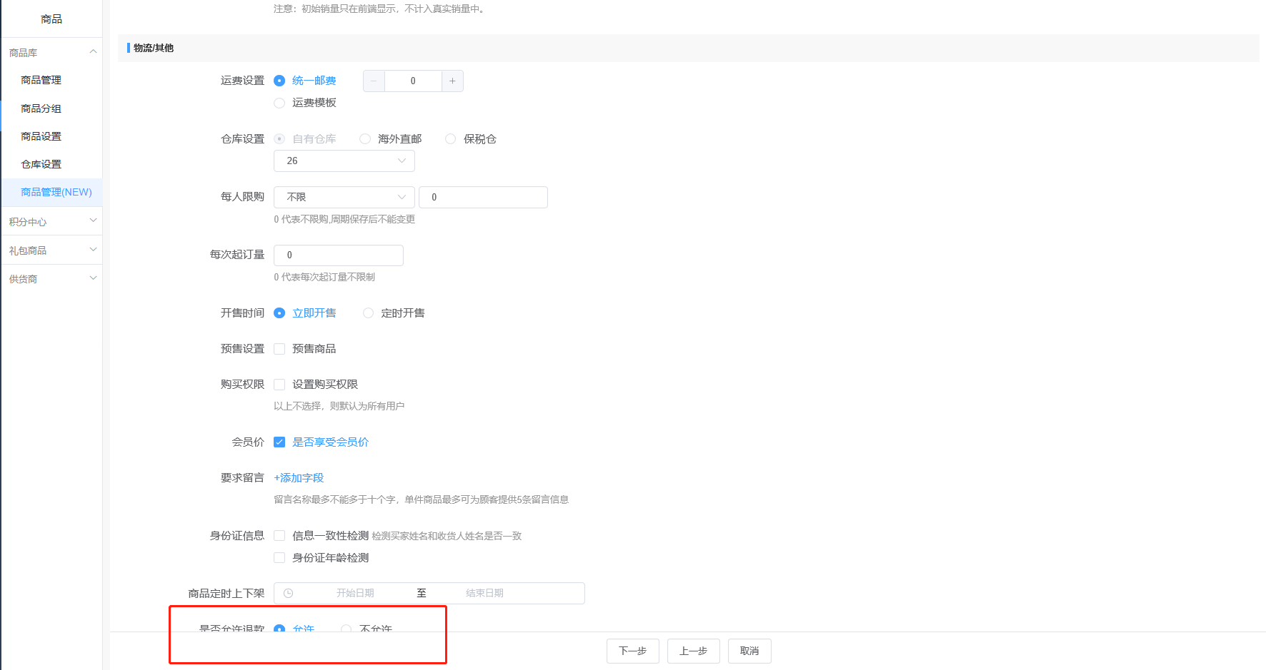 商品是否允许退款——所有商品默认为允许退款,但商家可针对某些特殊商品,如:生鲜类、易腐类商品等。