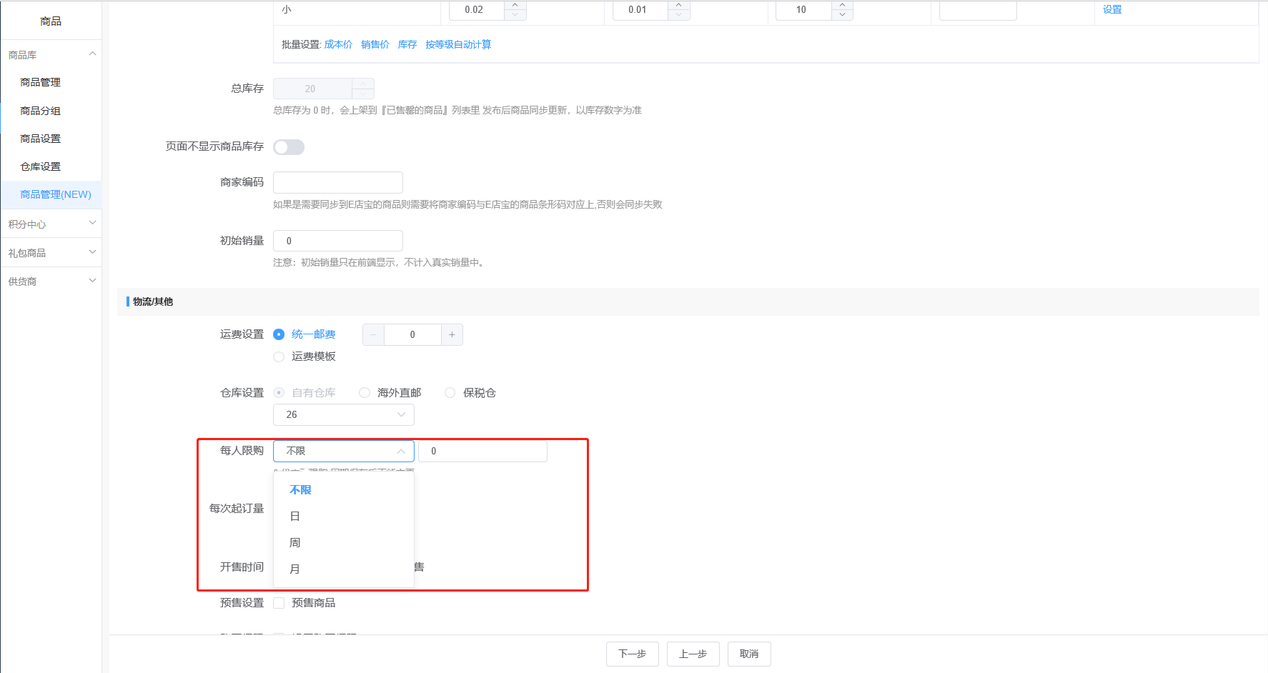支持按月限购——商家可在后台配置商品的限购周期,在原有的按日、按周限购的基础上,增加了按月限购设置。
