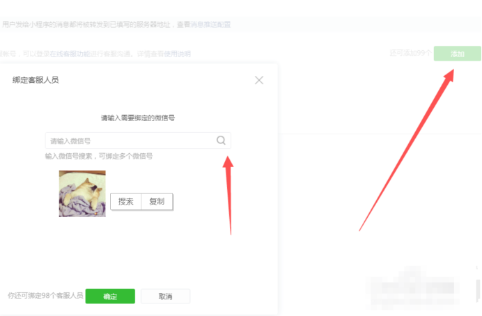 ### 2、点击添加,在弹出来的搜索框里面输入需要添加的客服人员的微信号