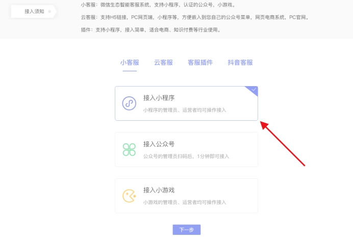 ### 2、在接入界面,选择“接入小程序”,点击“下一步”