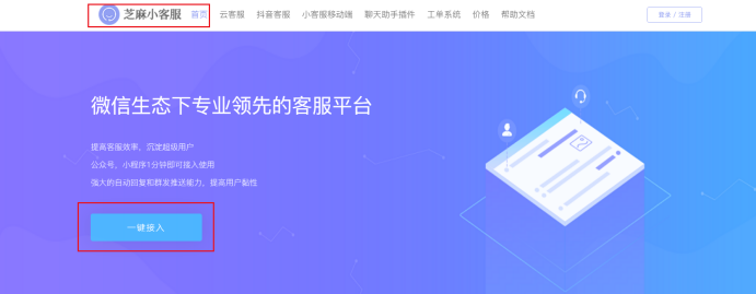 ### 1、登录小芝麻客服客服系统—首页,点击“一键接入”;如下图所示: