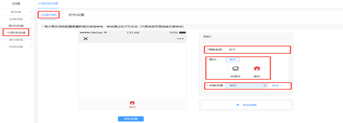 店铺导航商家可以进行自定义,最多添加5个导航,导航名称、图片样式及关联的页面可以进行自定义,关联页面可以选择首页/个人中心/购物车/微页面。