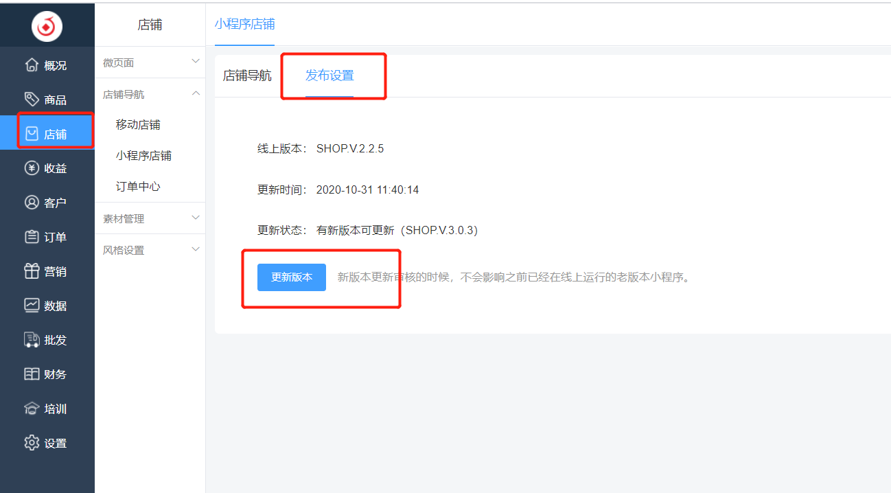 当系统检测到有可更新的版本时,在店铺-店铺导航-小程序店铺-发布设置会有提示“有新版本可以更新”,点击【更新版本】,之后等待微信审核;