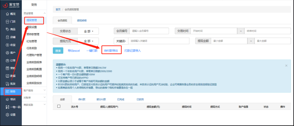 1.在【财务】-【资金管理】-【提现管理】,点击【待付款导出】;
