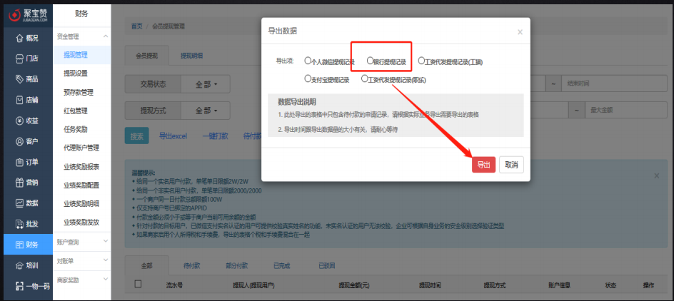 2.选择【银行提现记录】,点击【导出】;
