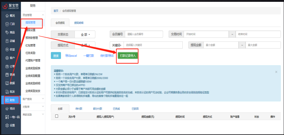 4.在【财务】-【资金管理】-【提现管理】,点击【打款记录导入】;