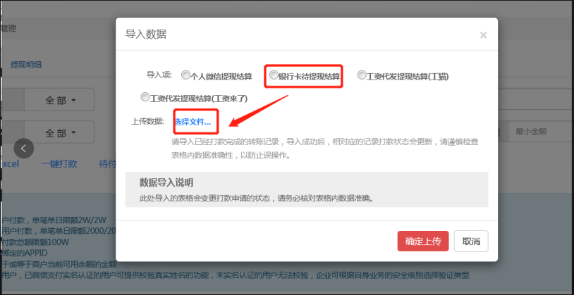 5.选择银行卡待提现结算,选择文件后点击【确认上传】,确认上传后,系统就会显示已打款;