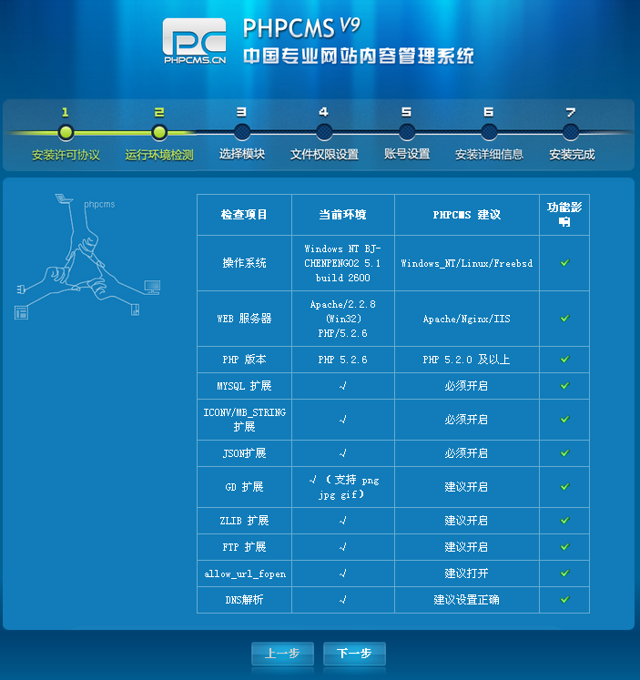 上传完毕后,开始在浏览器中安装PHPCMS V9,用*你的网站域名+'/install '*(例如:“http://www.abc.com/install”),进入准备安装界面: