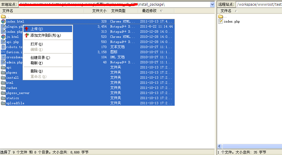 将其中 install_package 目录下的所有文件使用 FTP 软件以二进制方式上传到空间(以下截图中使用的 FTP 软件为 FileZilla),如下图所示: