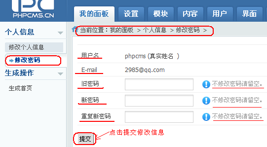 录入你的旧密码和修改的密码。 提交后,如提示成功则可完成修改操作,否则则提示错误消息。如下图所示: