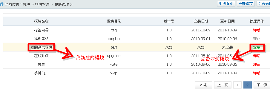 将已经创建好的模块放在指定位置,运行后台后,在“模块管理”处会找到你创建的模块。如下图: