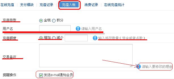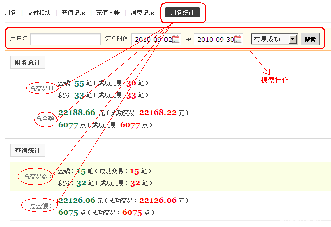 供用户和管理员查询会员在线充值统计(财务总计,查询统计)。