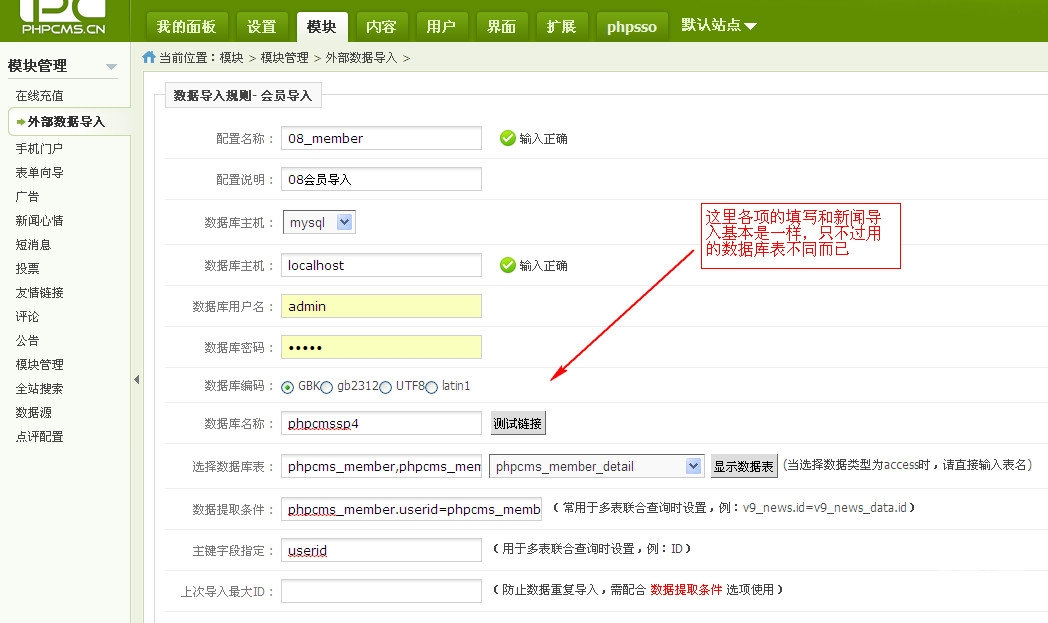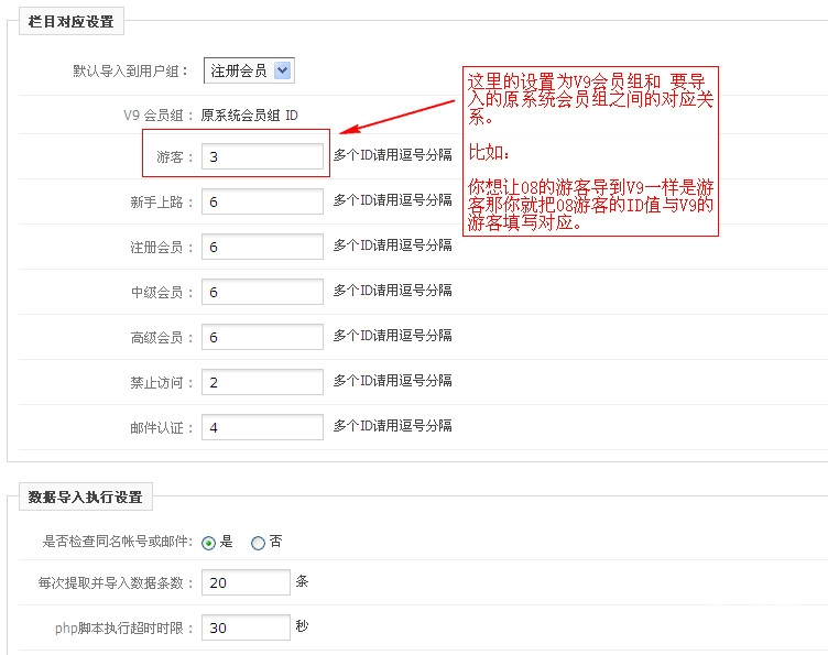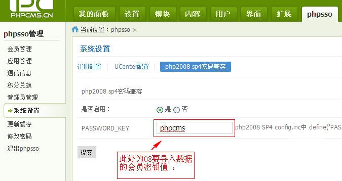 最后保存配置,执行数据导入,这样就把会员数据给导入到V9里来。 但是由于08和V9的会员密码加密方式不一样,所以还需要在PHPSSO管理中心做如下配置,很重要! 否则导入的会员将无法登陆!