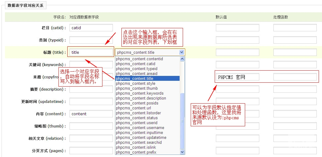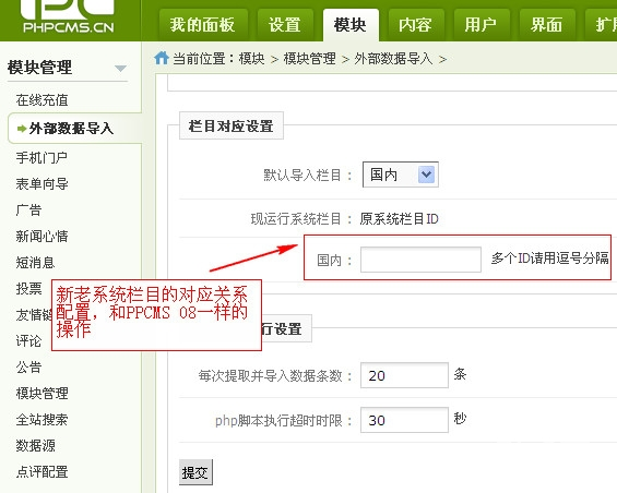 最后为各栏目的对应关系设置和每次导入多少条的配置,如下图所示: