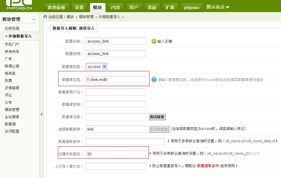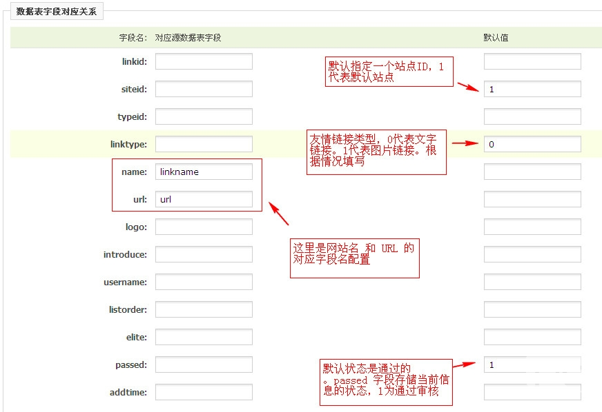 配置各字段的对应关系,因为ACCESS里并没有V9友情链接必须的字段,所以在站点ID,linktype(链接类型),passed(链接状态) 等字段设置默认值。