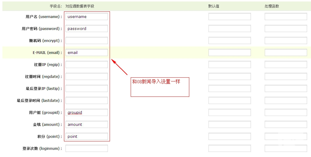 会员的导入和信息导入操作原理是一样的,只不过配置的表和字段不同而已。如下图所示: