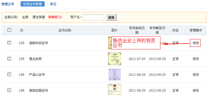 管理黄页企业的注册企业信息,可进行查看、修改、删除、审核、推荐等操作。