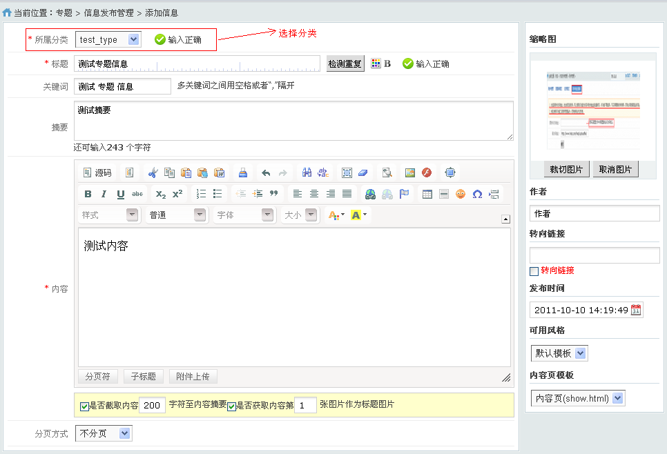 和添加内容相同,其中要选择专题类别。如下图所示: