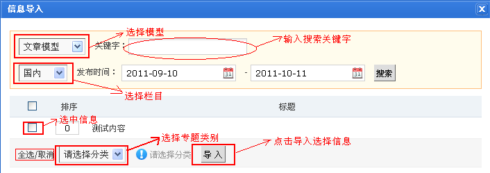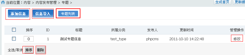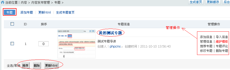 管理(添加,修改,删除,排序,浏览,信息导入)对应专题下的信息。如下图所示: