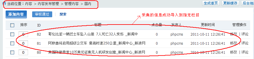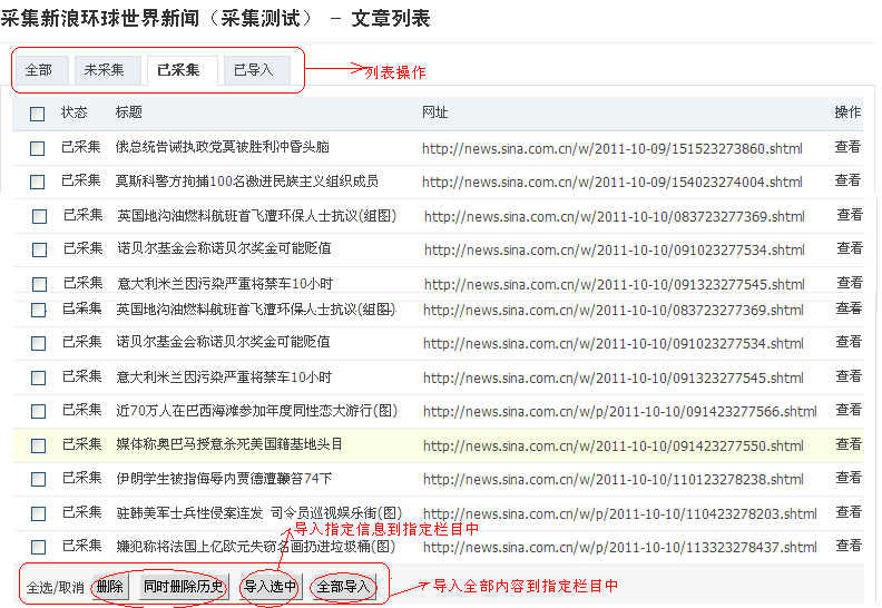 提交成功将采集内容导入到指定栏目(如下图所示)。在此期间请耐心等待, 完成后会自动转向。至此一个简单的采集流程就操作完成。在指定的栏目下已经存在你采集的内容信息。