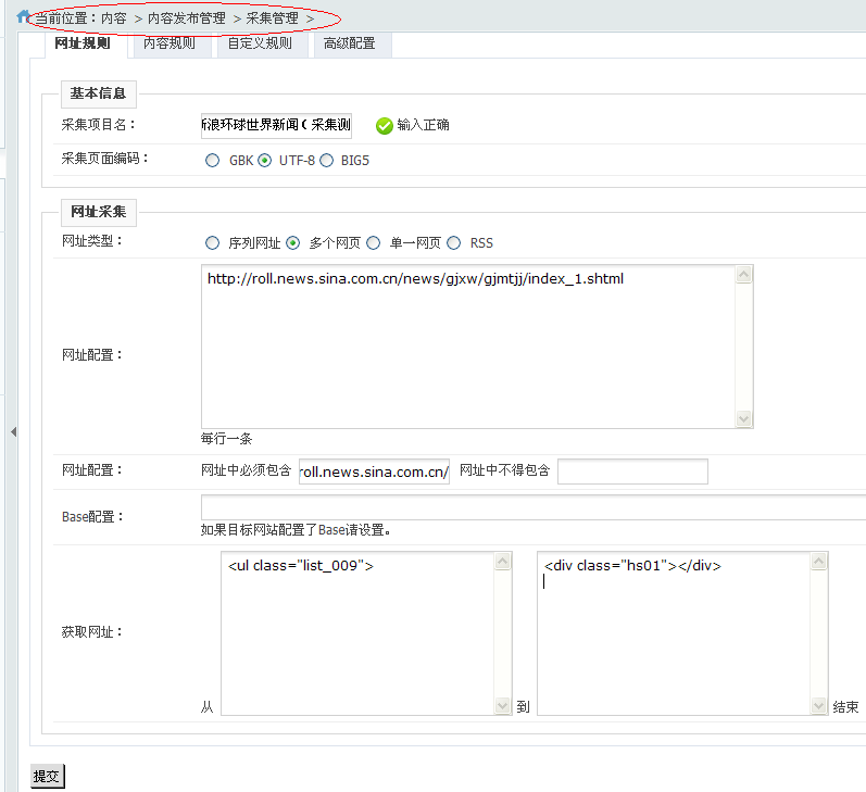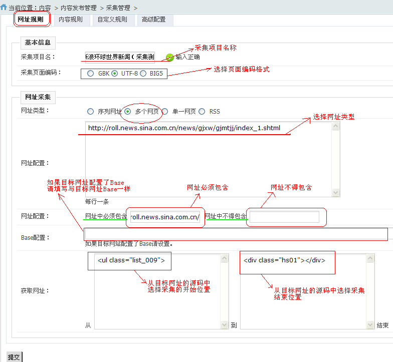实例说明: 目标:采集新浪新闻到V9系统 “国内” 栏目中。 目标网址:http://roll.news.sina.com.cn/news/gjxw/gjmtjj/index.shtml 1、添加采集点 2. 网址规则配置