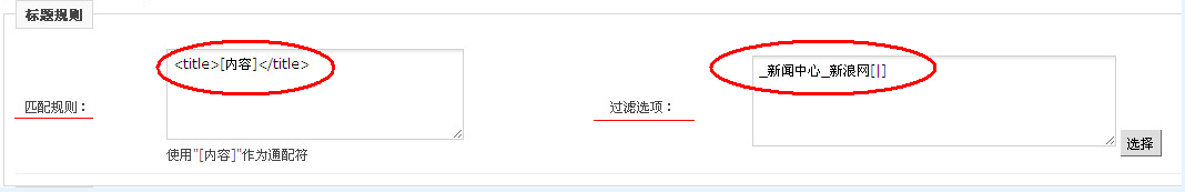 **标题采集配置:** 从网页<title></title>里取标题,并去除不需要的字符。如下图