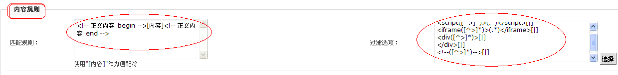 **内容采集配置:** 新浪新闻最终页,新闻内容都包含在 <!-- 正文内容 begin --> <!-- 正文内容 end --> 之间,而且这二个结点,在整个页面源代码中具有唯一性。所以可以以此为规则取内容。并对内容进行过滤。如下图