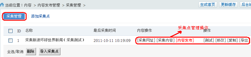 添加采集点测试成功后,你可以管理你添加的采集点(采集网址,采集内容,内容发布,测试,修改,复制,导出).如下图所示: