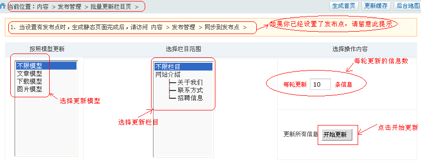 选择需要更新的模型和栏目,输入每轮更新的信息数目提交则完成批量更新栏目页操作。如下图所示: