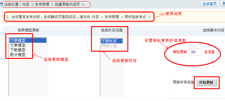 选择需要更新的模型和栏目,输入每轮更新的信息数目提交则完成批量更新内容页操作。如下图所示: