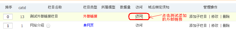 添加成功后,到“栏目管理”找到添加的外部链接,点击“访问”(如下图)就跳转到指定页面了。