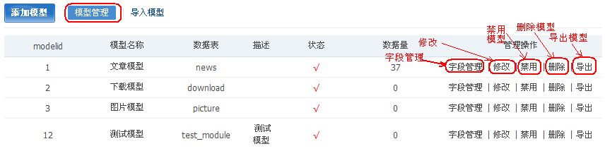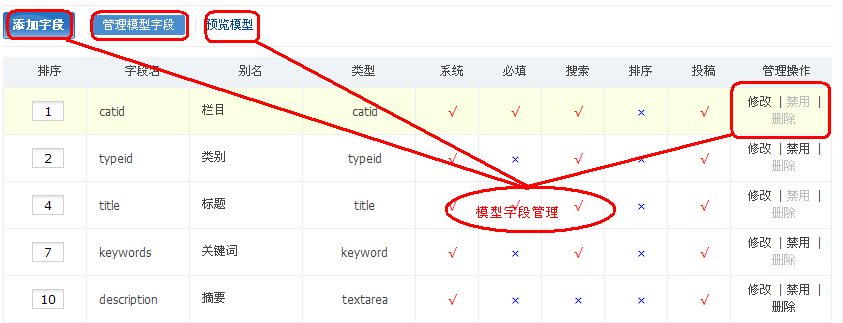 可以对该模型下的字段进行管理(添加,删除,修改,禁用,预览)。如下图所示: