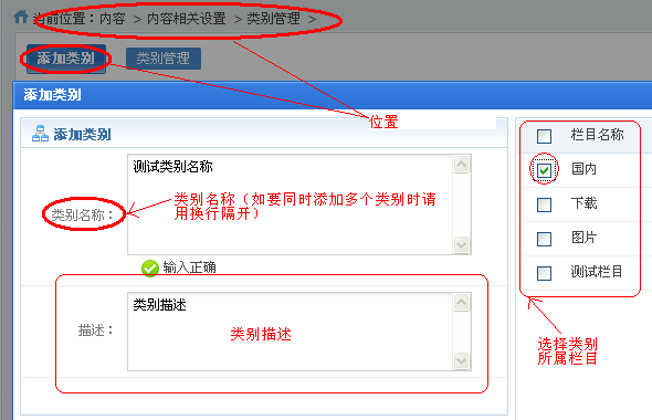填写类别基本信息,选择对应栏目。如下图所示: