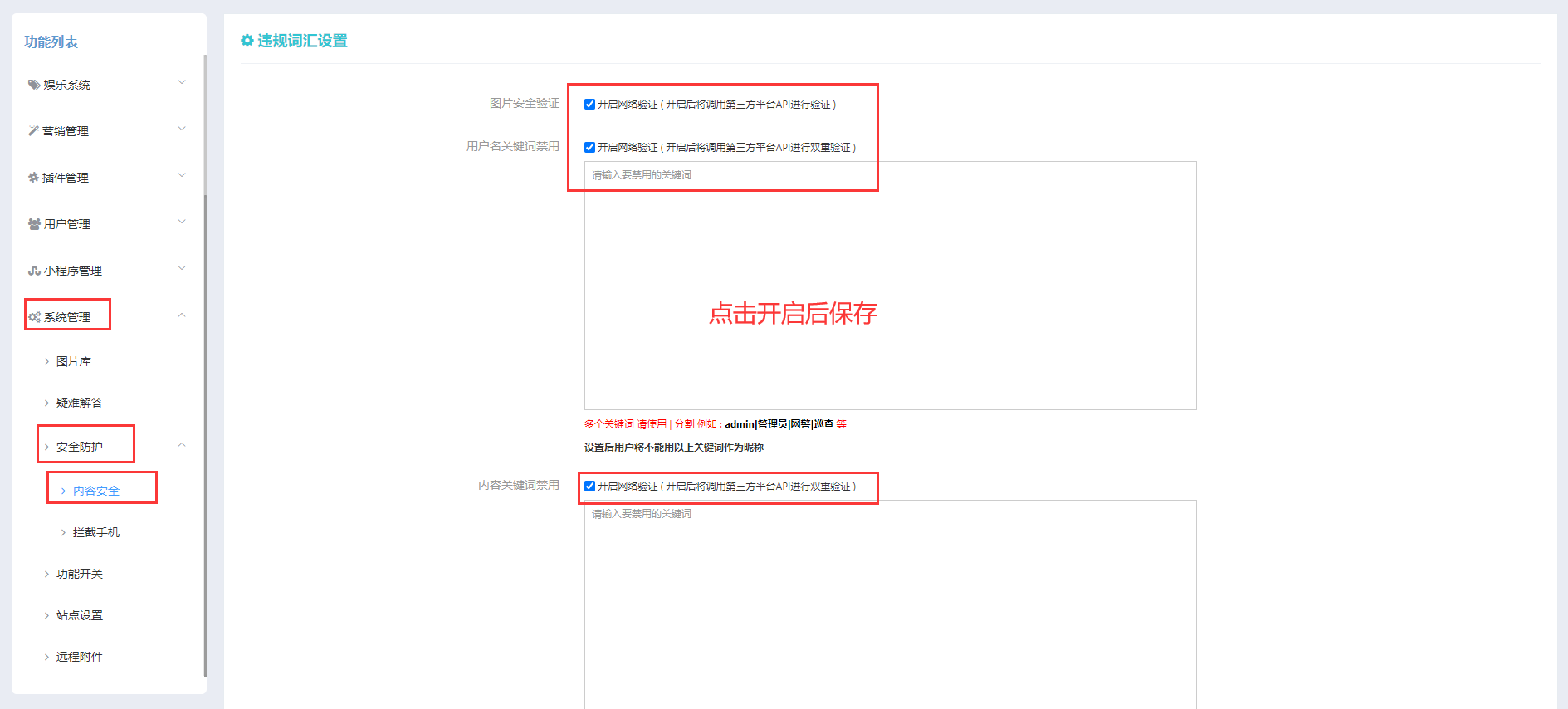 ## 4.进行小程序内容安全设置【系统管理 -> 安全防护 -> 内容安全】
