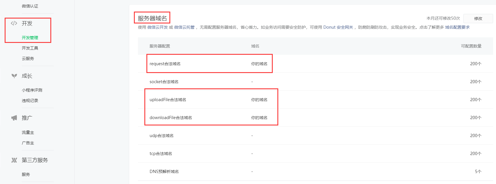 ### 是否设置:小程序服务器域名(开发管理->服务器域名设置)