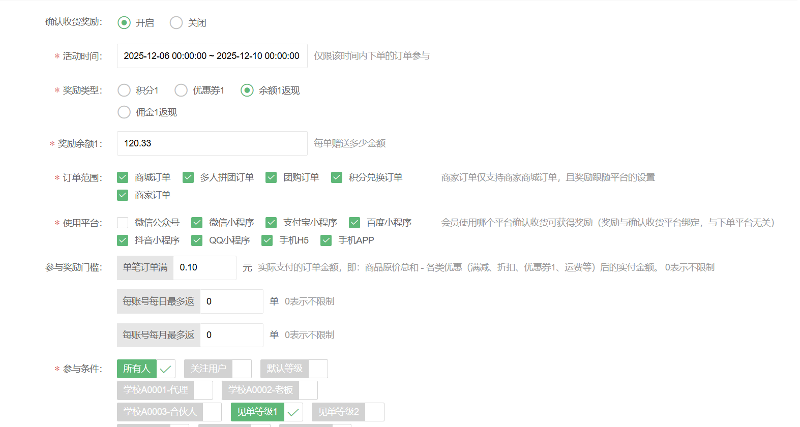 确认收货奖励:开启/关闭,功能开关,关闭则该功能无法使用。