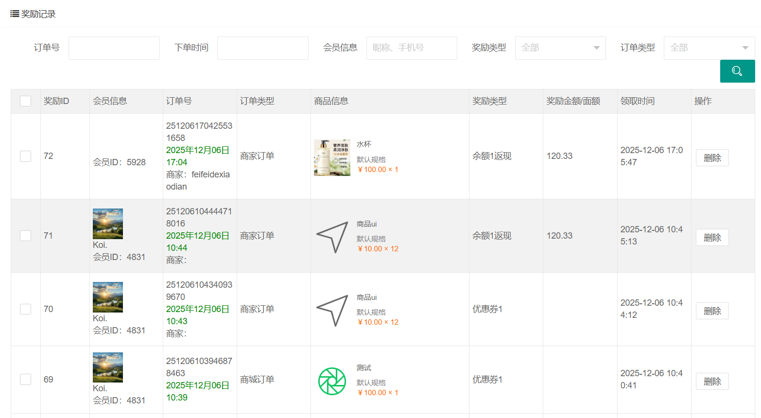 用于查看会员确认收货获得的奖励记录,可进行筛选和删除操作
