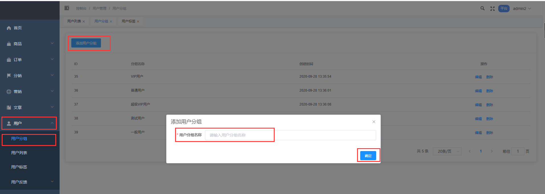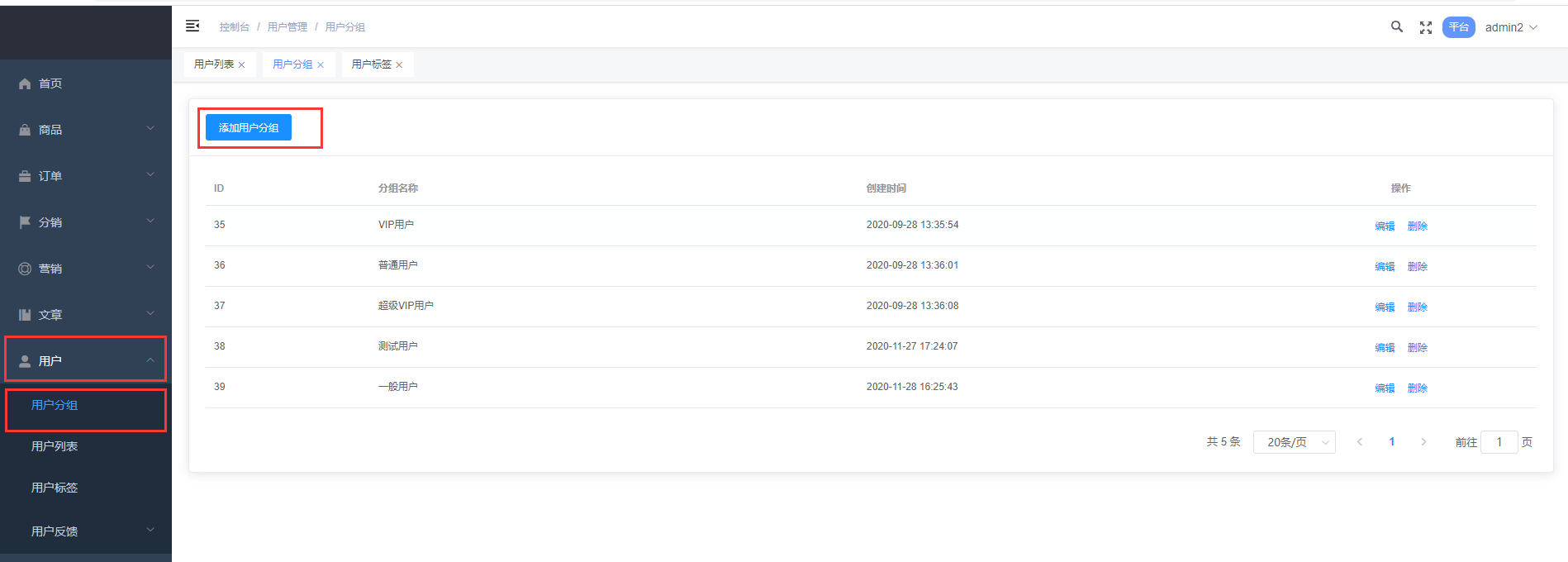 **用户分组**:将用户按特征、特点分为小组,方便管理和运营,一个用户只能被分到一个组