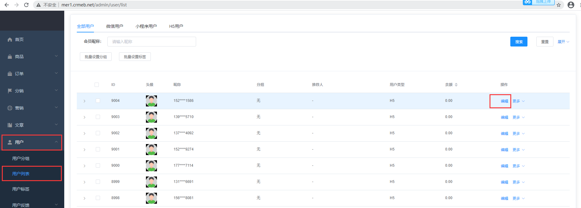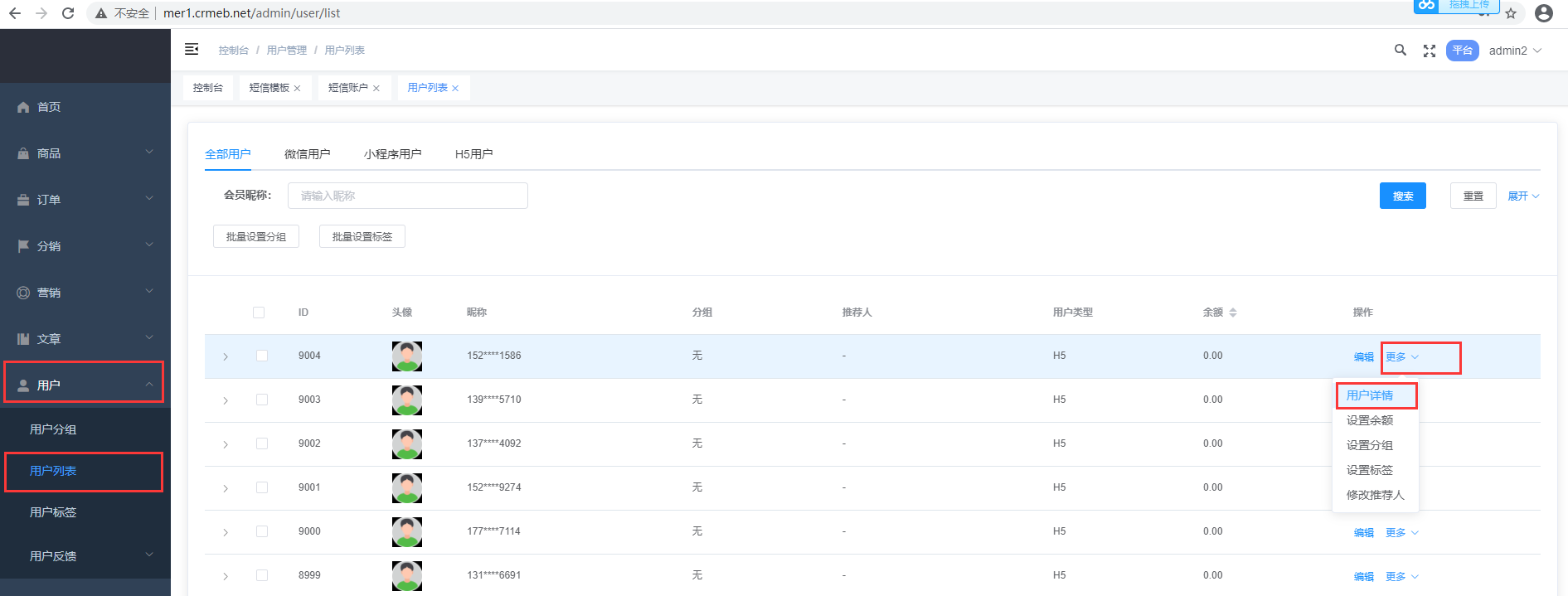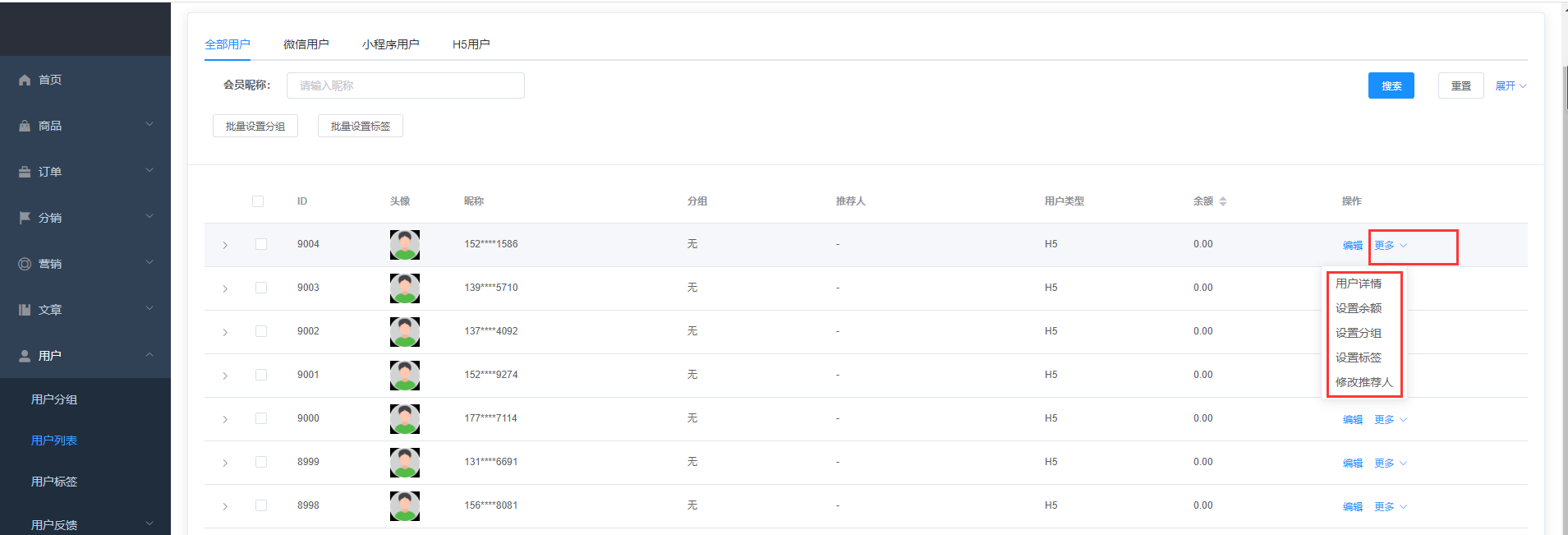 **用户列表**:平台所有用户信息的展示与查看,通过公众号、小程序、H5不同类型进来的用户均展示在此。