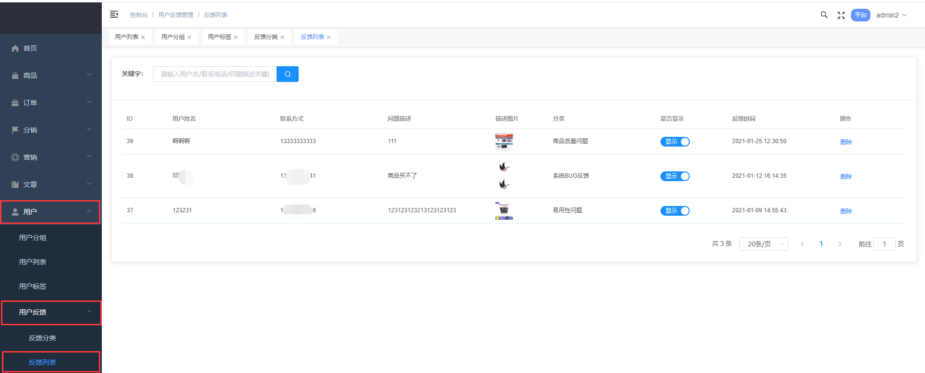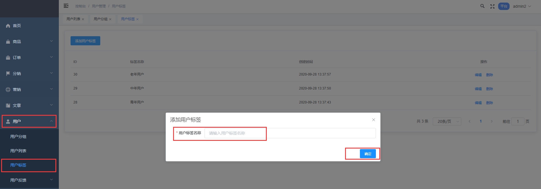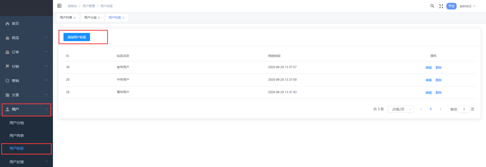 **用户标签**将用户按特征、特点添加标签,方便管理和运营,一个用户可以被打上不同的标签