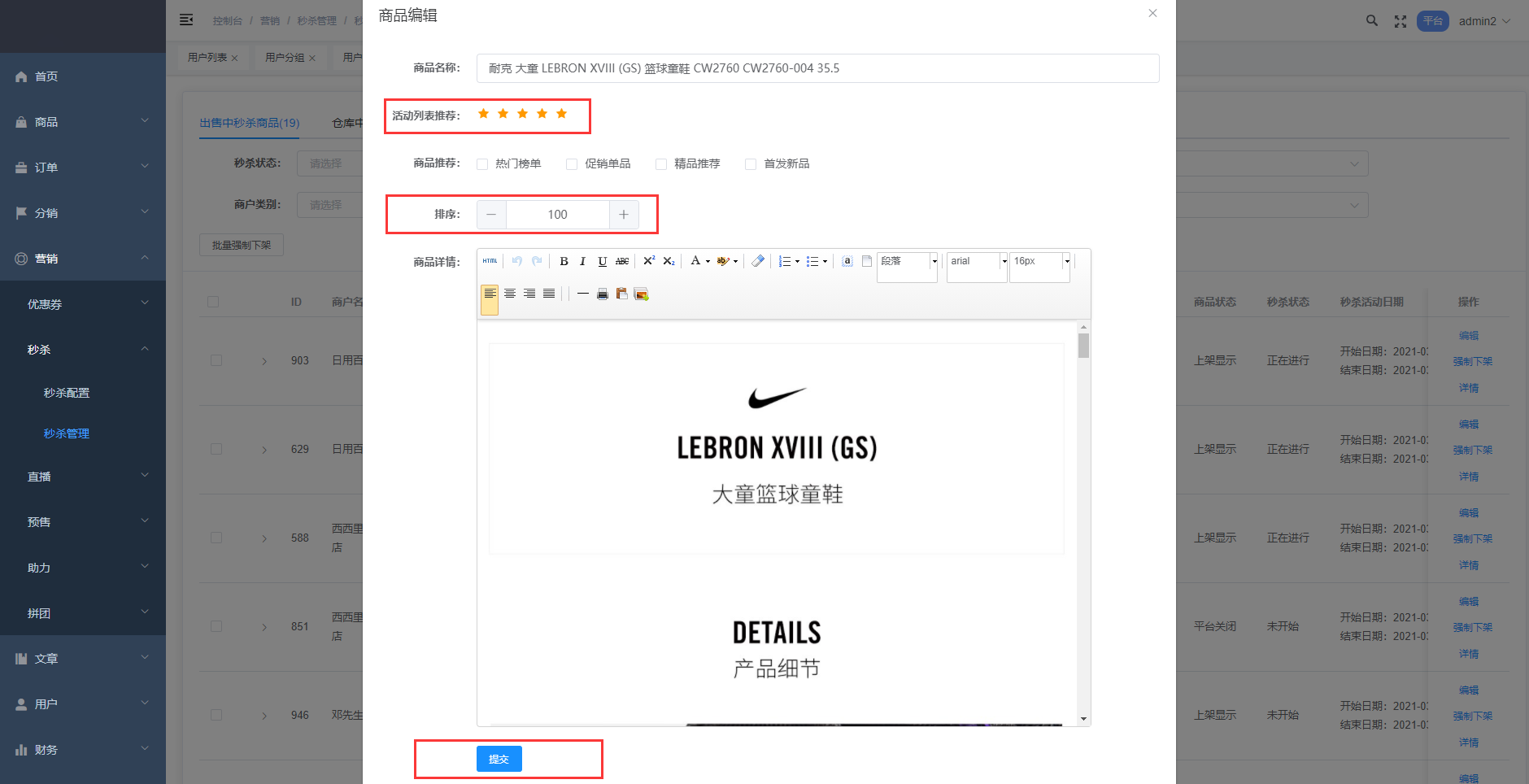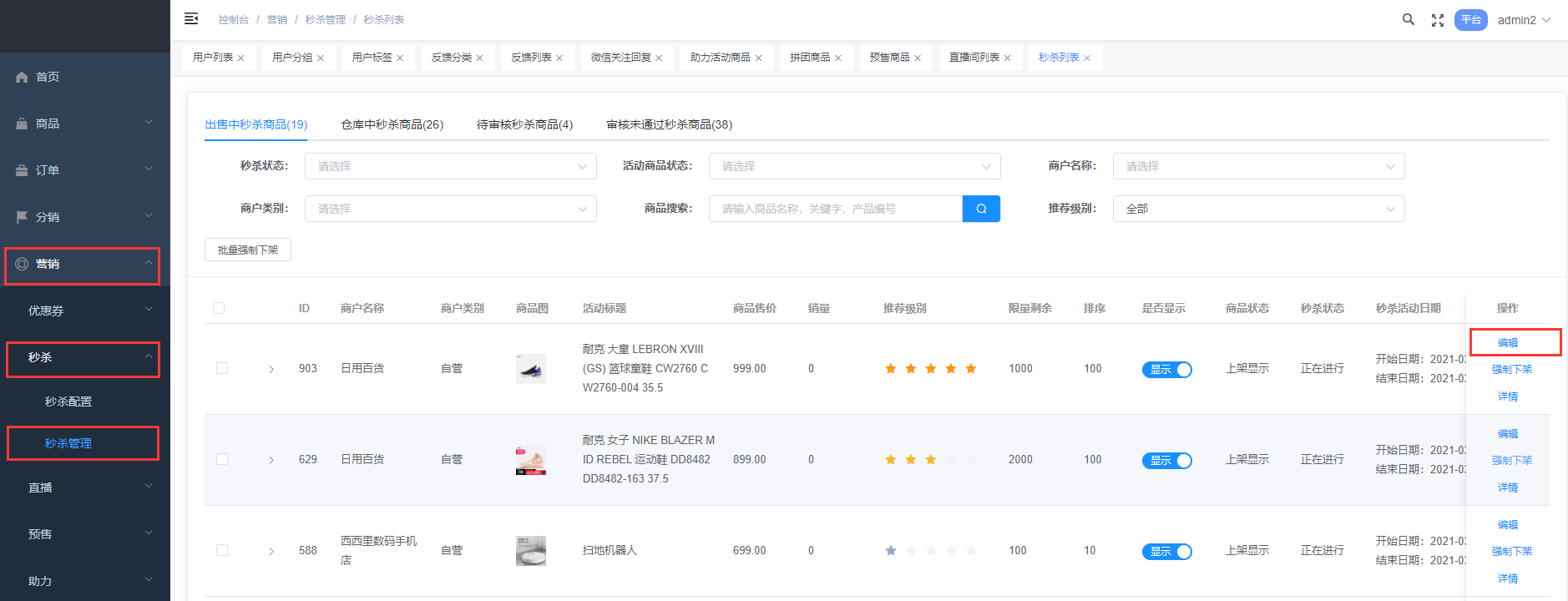 **位置:平台后台>营销>秒杀>秒杀管理**