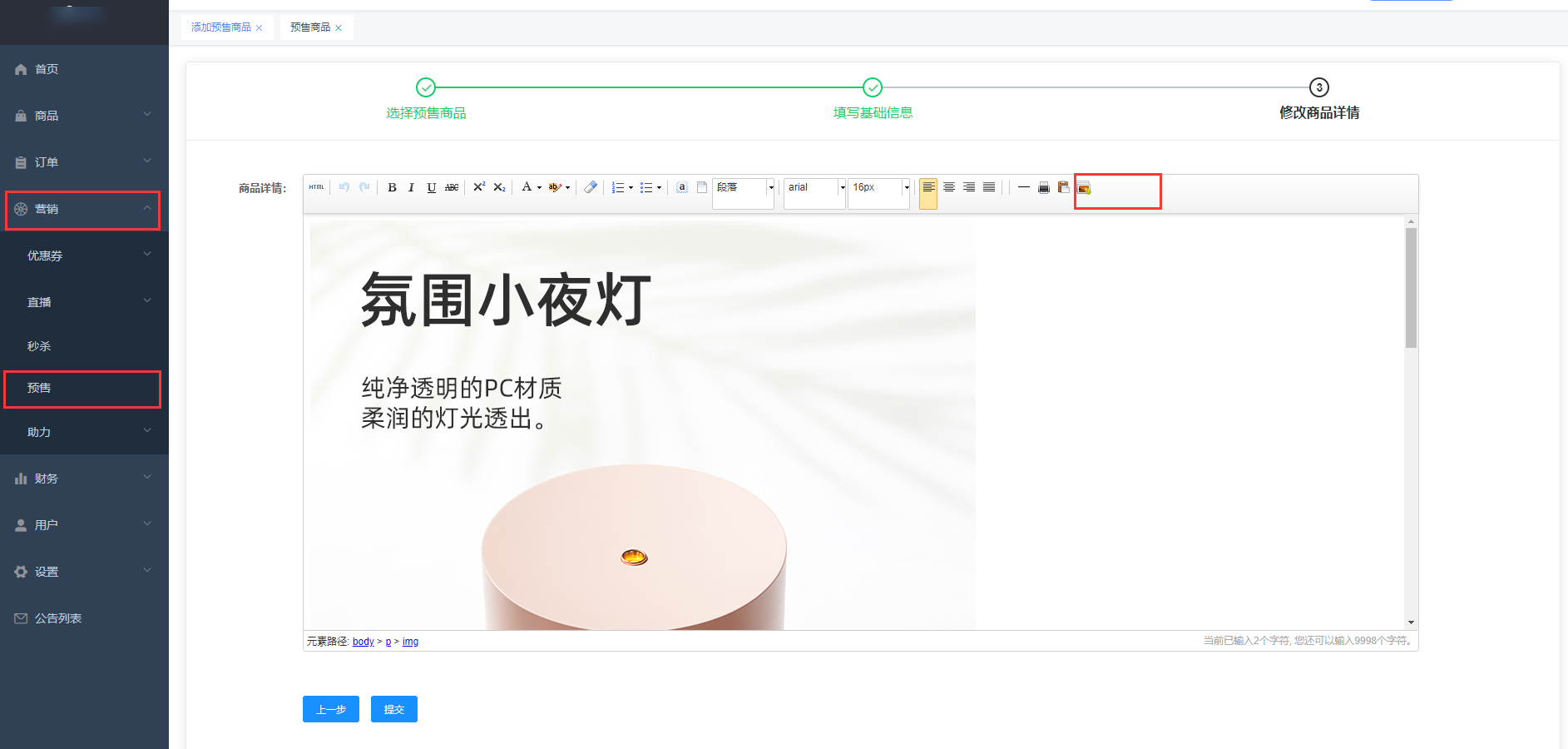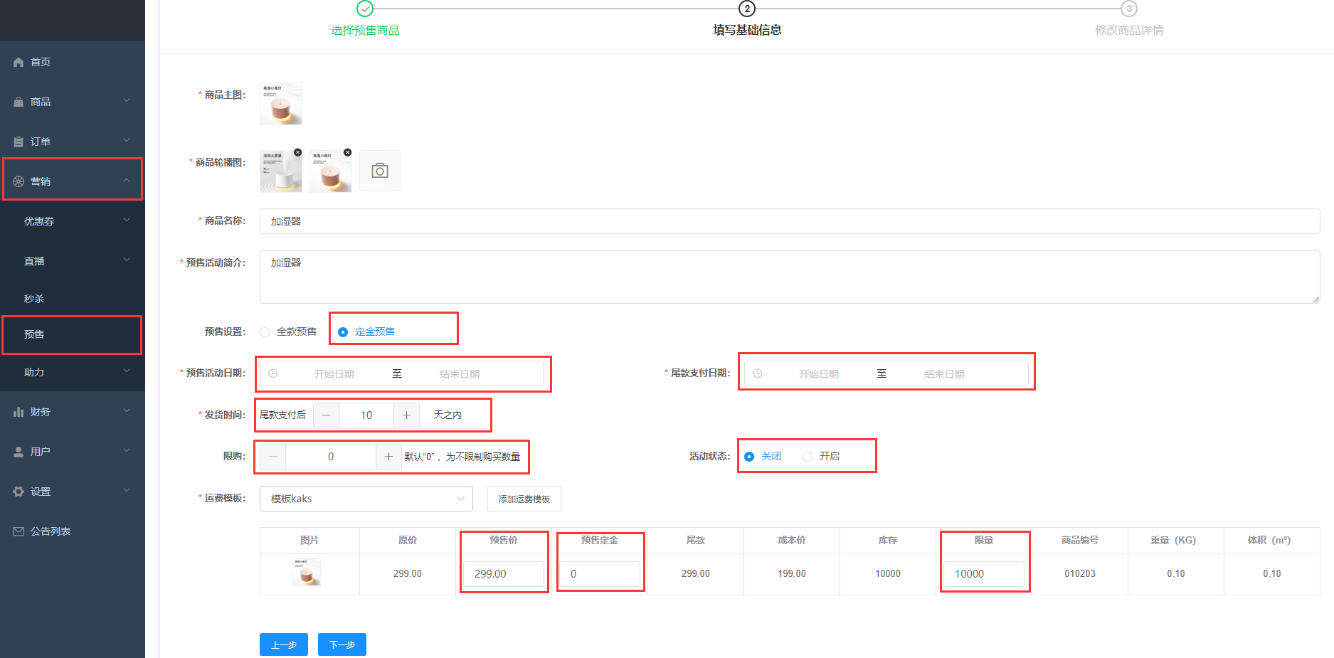 **位置:商户后台>营销>预售>添加定金预售商品**