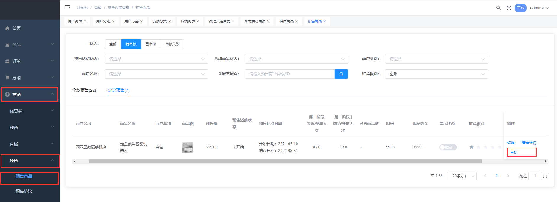 1. 平台后台审核定金预售商品