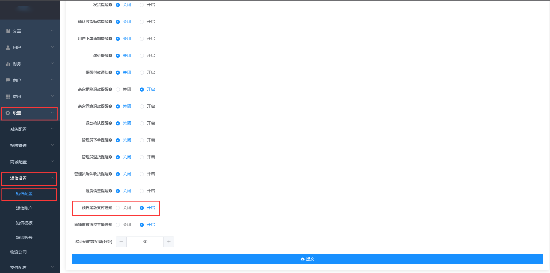 **位置:平台后台>设置>短信设置>短信配置**