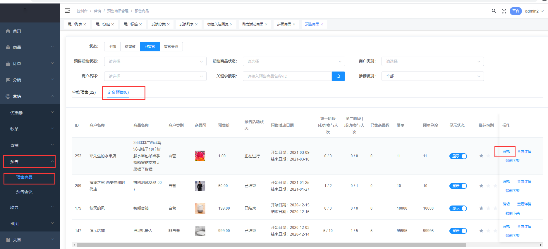 **位置:平台后台>营销>预售>定金预售**