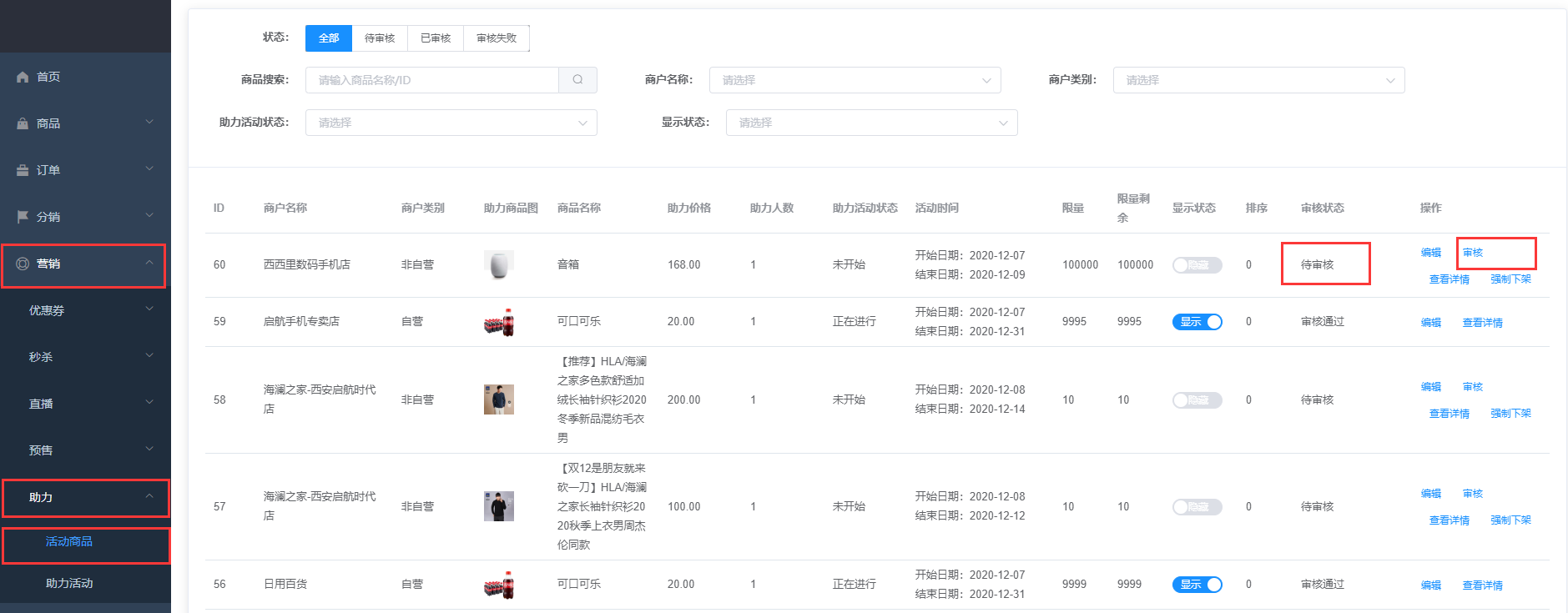 商户添加助力活动商品,平台后台审核,活动发布,用户发起助力活动,参与助力人数达到商城设定人数,即有资格以助力价购买到活动商品。