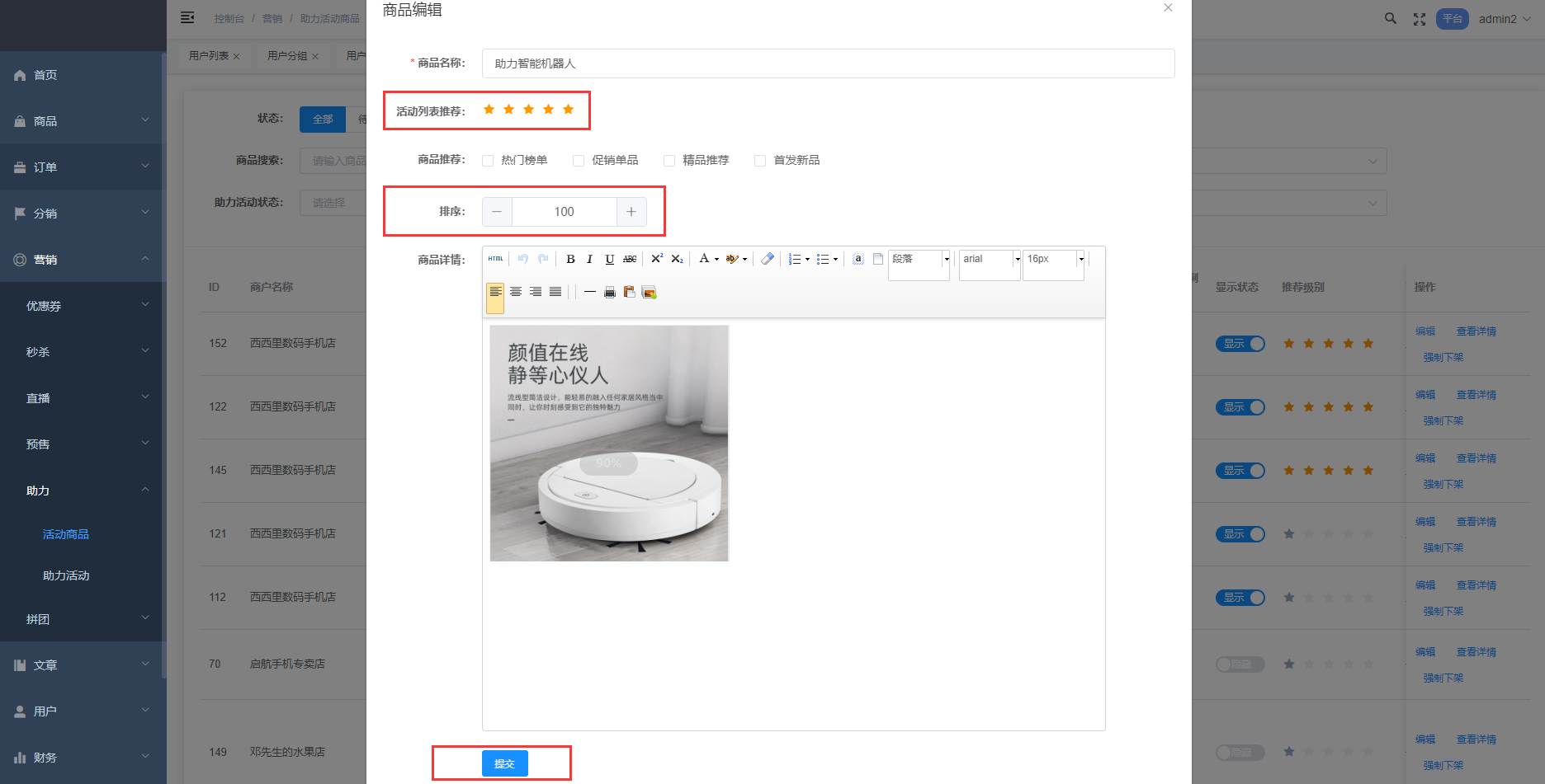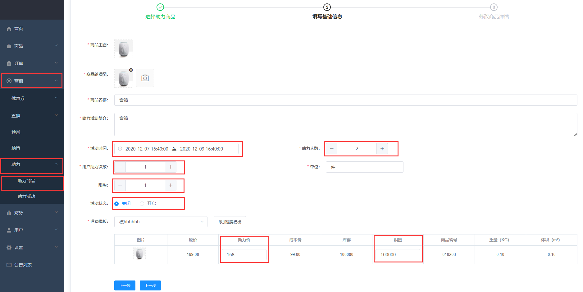 8. 可修改助力商品的售价和限购数量( “限量”,与普通商品为共享库存)