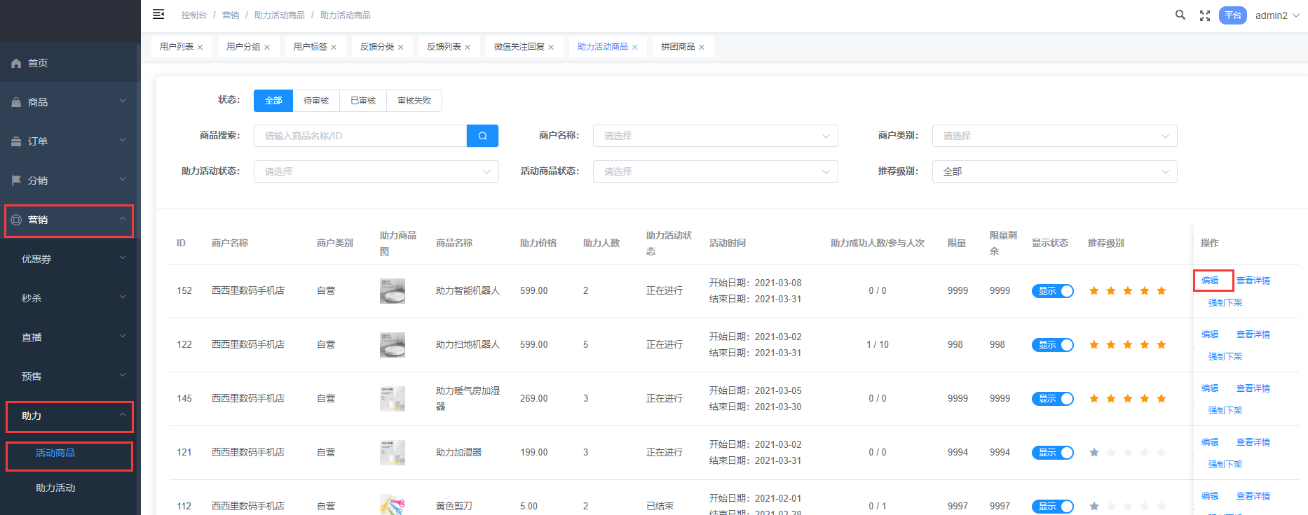 2. 点击“编辑” - 设置助力活动在移动端助力列表优先展示顺序